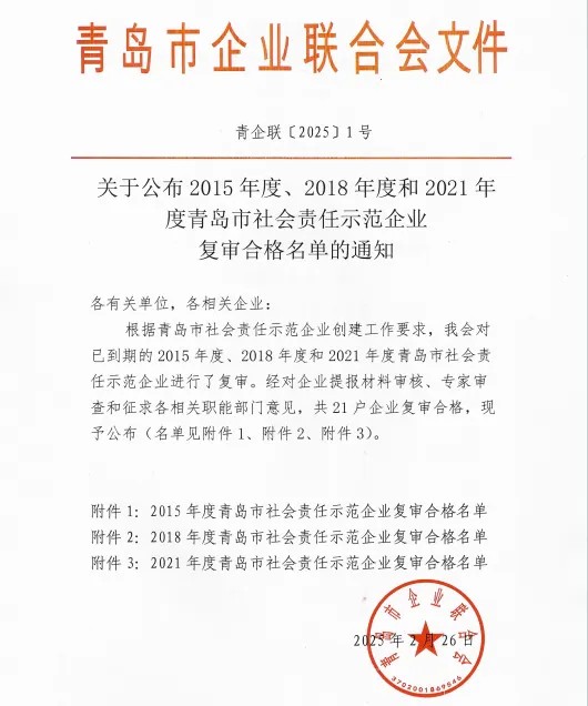 304am永利集团自2018年获评青岛市社会责任以来,连续两次通过资格复审,此次复审合格是对304am永利集团服务青岛经济发展、履行社会责任的再一次充分肯定和认可。